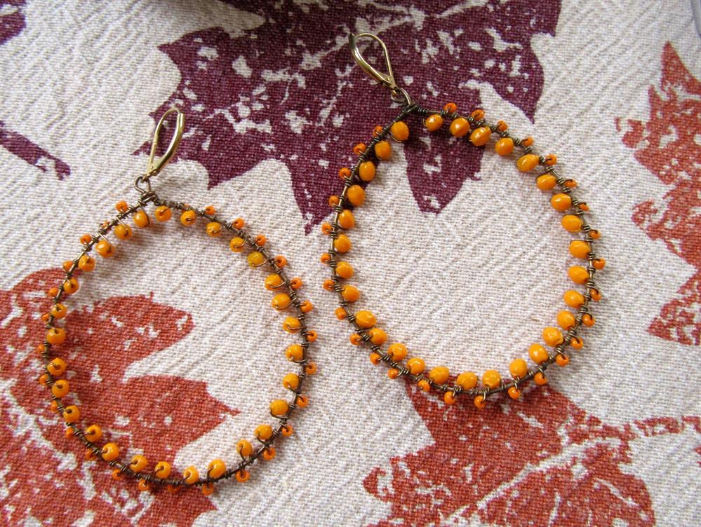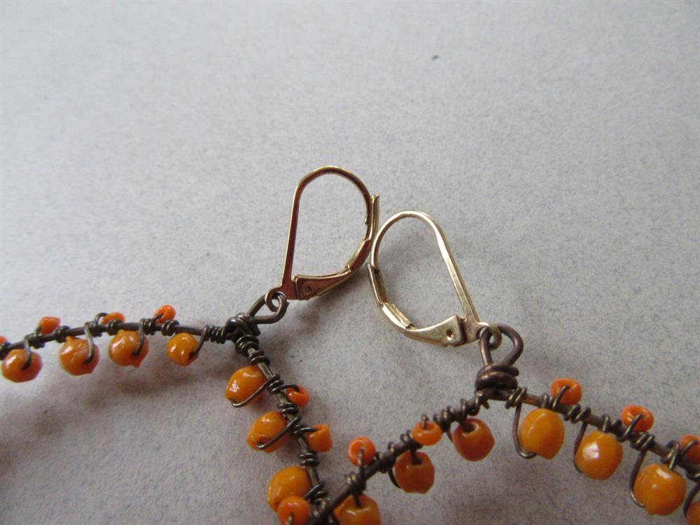WONDERFUL large pair of orange art glass beaded hoop pierced earrings. They remind me of Bittersweet vine. The beads appear to be hand blown. The hoops measure 3 1/4" long. The hoops measure 2 1/4" across.