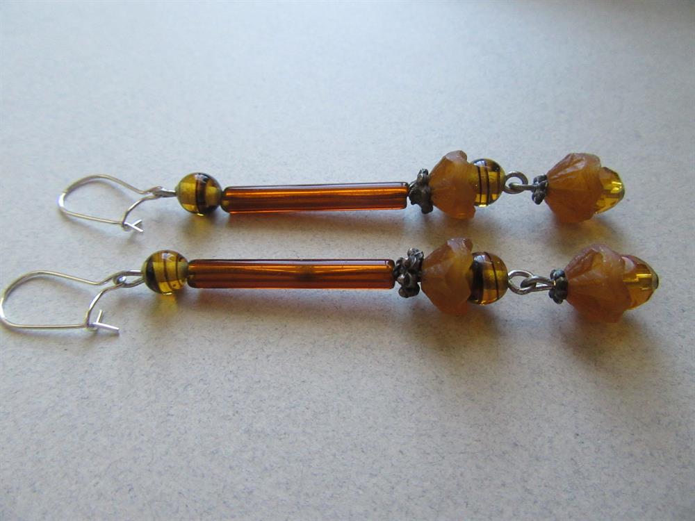 My Mom made these earrings out of antique glass rods from a 1920's lamp shade and other vintage beads back in the 1990's. Brand new silver plate ear wires have been added by me. They measure 2 1/4" long, not including the ear wires. Excellent shape.