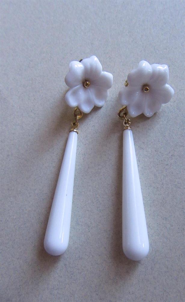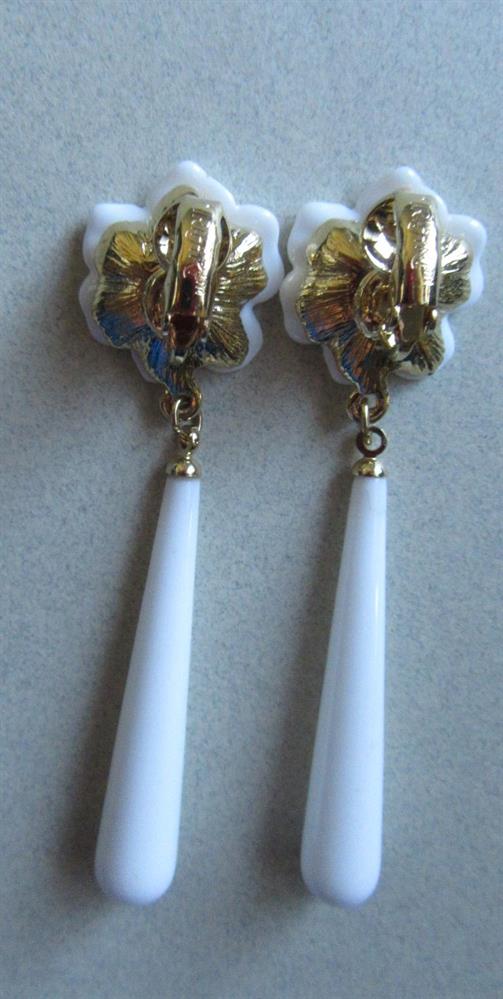 Vintage Trifari signed white flower clip earrings. They measure 2 1/2" long. Clip tensions have been tested. With a loupe, I found a tiny line on one of the earring "dangles" that may be a hair line crack. View last photo. Not bothersome. Sold as found.