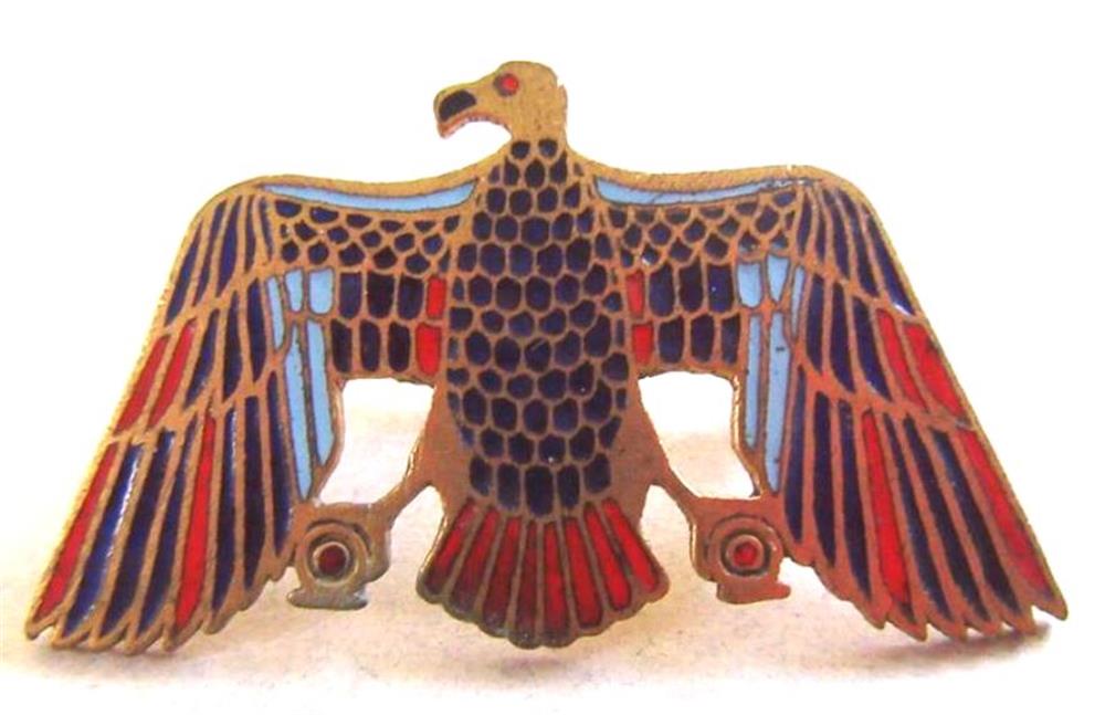 Vintage enameled brass Egyptian Revival falcon pin. It measures 2" long.