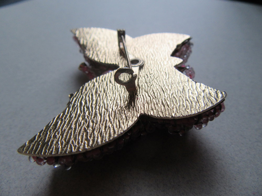 Vintage heavily glass beaded butterfly pin. The back is signed Japan. This pin is missing the pin "flipper", but it still can be worn with the"c" style part that is left. See last photo. Sold as is.