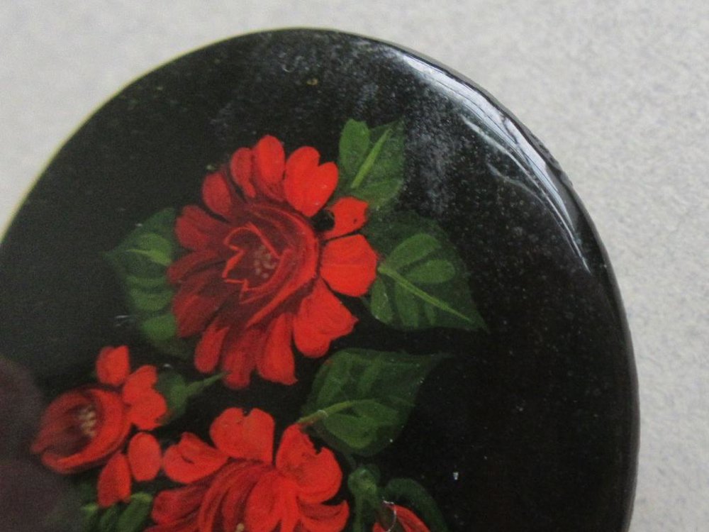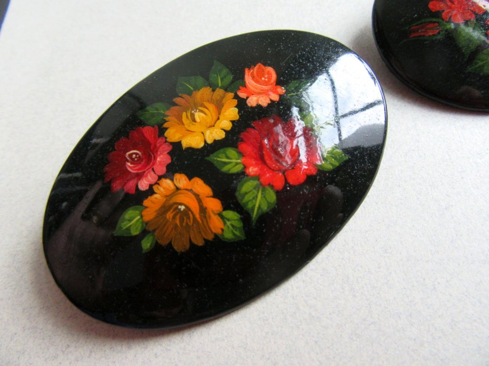 Two vintage Russian lacquer floral pins. The larger one measures 2 1/2" long. Signed on the backs. the round pin has a filmy mark which I am not sure if it will come off. I am throwing that one in.