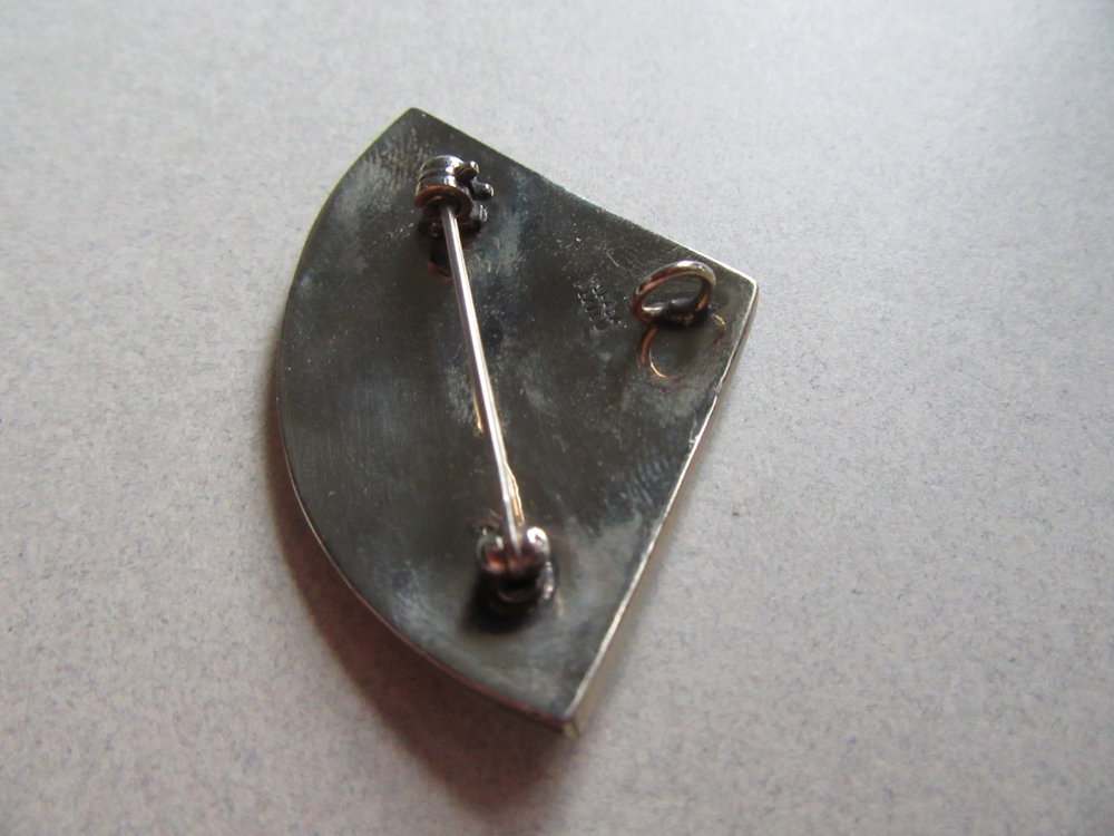 Vintage Alpaca Mexico inlay pin that has a bail on the back off you wish to wear to from a chain. Inlay mother pf pearl and abalone. Measures 2" wide and is in gorgeous shape.