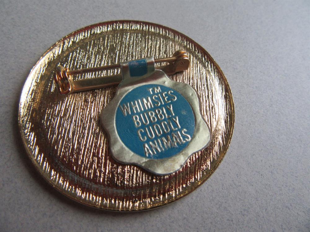 "Whimsies Bubbly Cuddly Animals". And the reverse has a pic of a kitten. the pin measures 1 3/4" across. Never worn. It has a pin head spot at the bottom where the coating didn't cover and a bit of discoloration on the back. . No big deal. Sold as is.