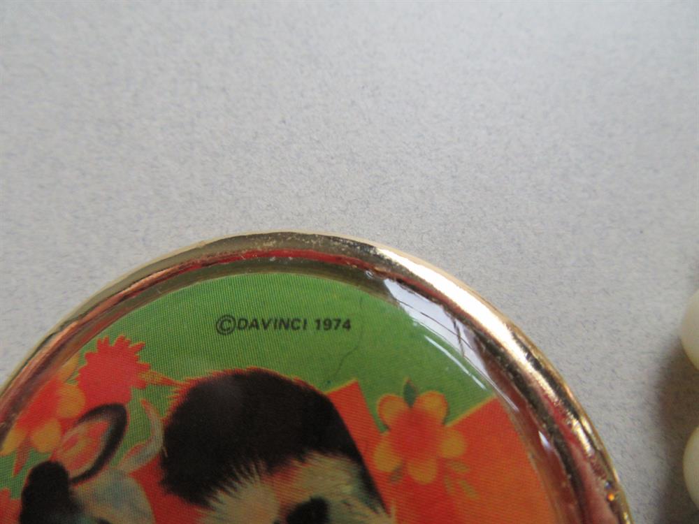 Vintage Davinci 1974 dog in hat litho pin. The foil tag reads