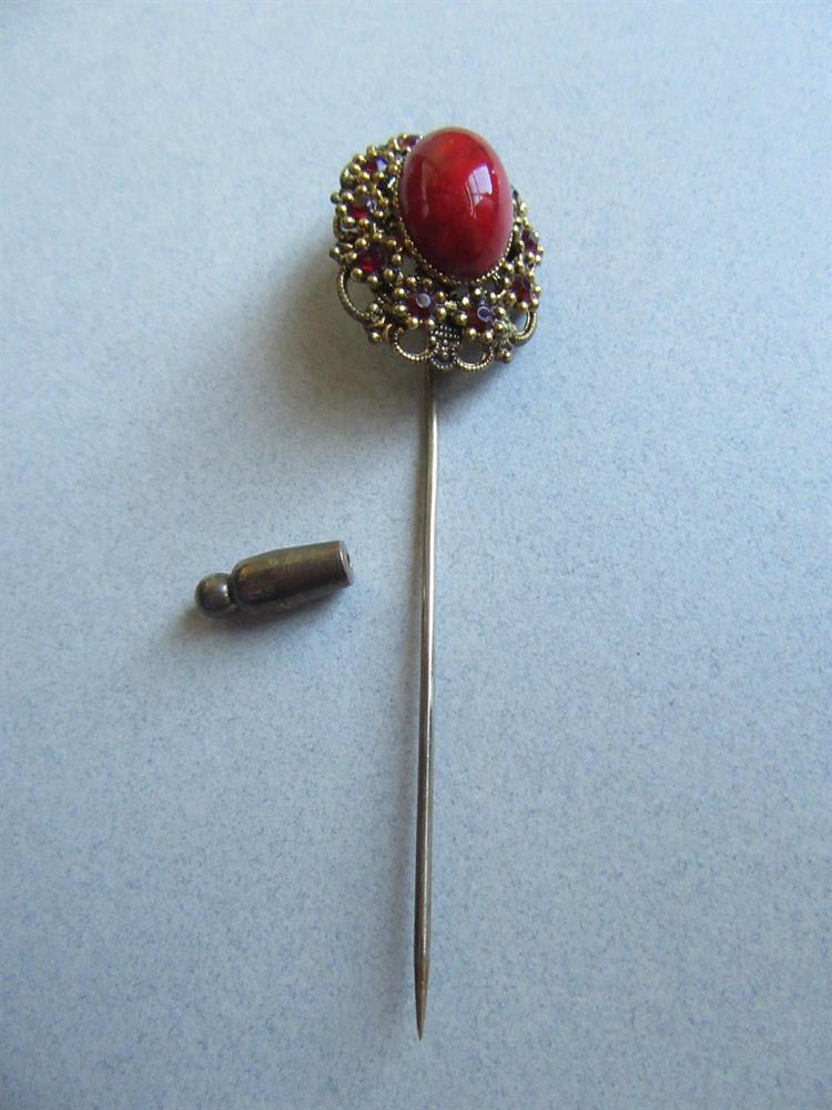 Vintage Western Germany red glass cabochon with rhinestones stick pin. It measures 3" long. The bottom piece pushes on and you pull and turn to the left to take it off. Wonderful shape!