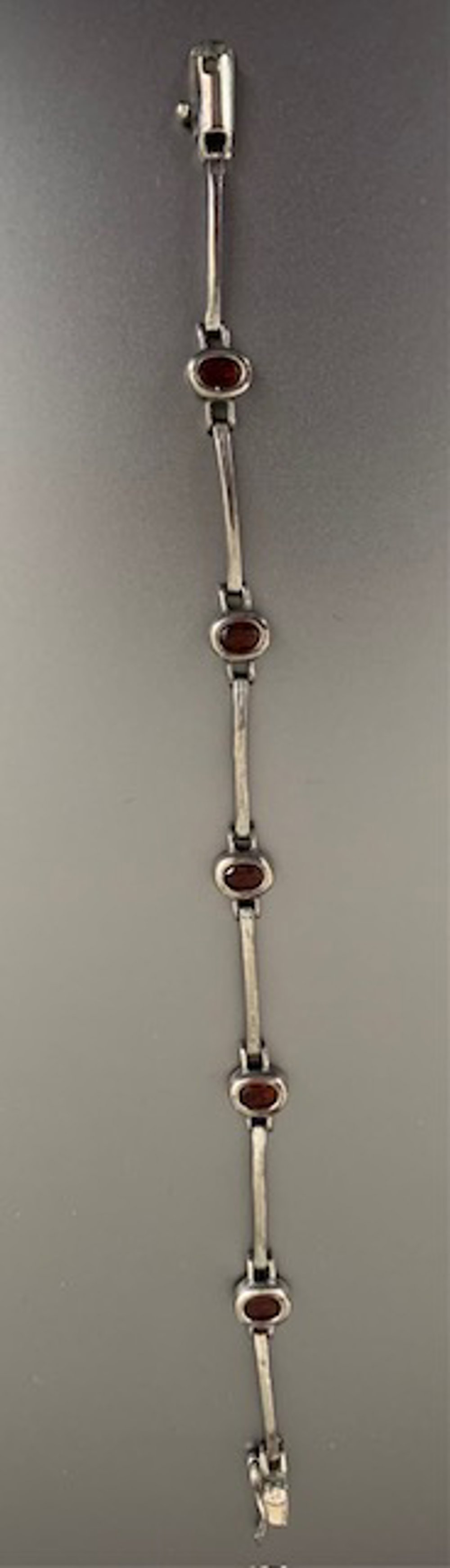 Sterling silver and garnet bracelet Measures 7" long. So this would be for a slightly smaller wrist. The standard bracelet size is 7 1/2". Marked FAS and 925. Age appropriate wear. Safety clasp on side. Weighs 6.8 grams. Good shape! Can use a polish. I will give it a quickie polish before shipping.