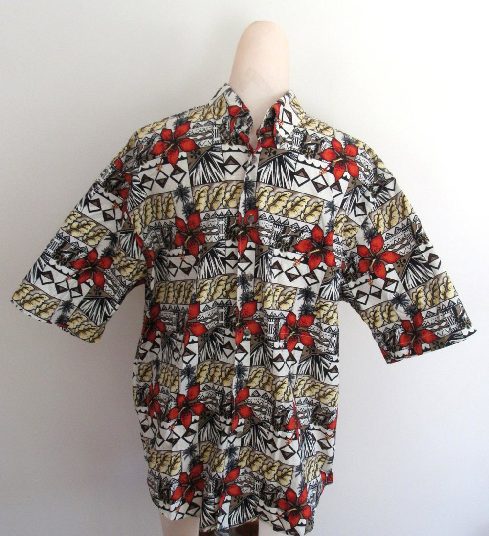 1990's Natural Issue 100% cotton Hawaiian shirt. Sz. Med. Wonderful orange hibiscus flowers palm trees and more. Front pocket, buttoned collar tips and tapered shirt tail. A little dressier than your typical Hawaiian shirt. The condition is absolutely beautiful.