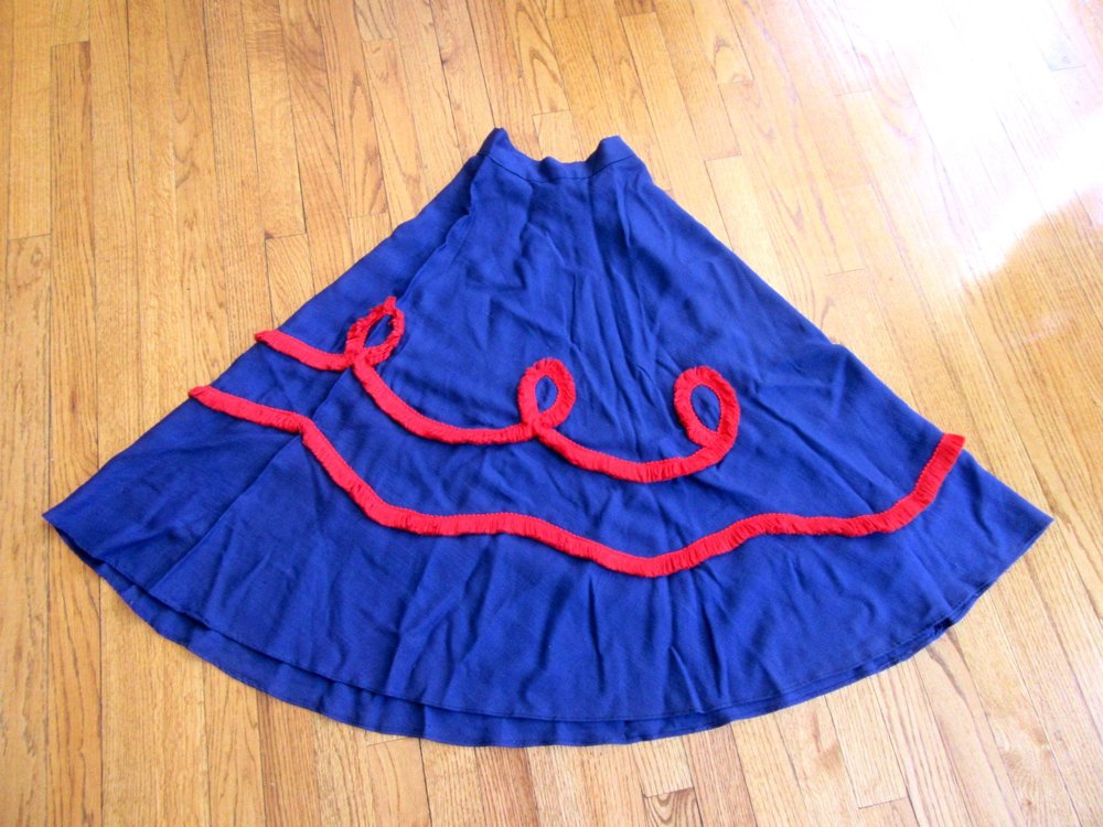 Vintage original 1950's dark navy blue with red yarn fringe trim circle skirt. Please excuse the wrinkles. The color is a darker navy in person. NEVER WORN! Excellent.
