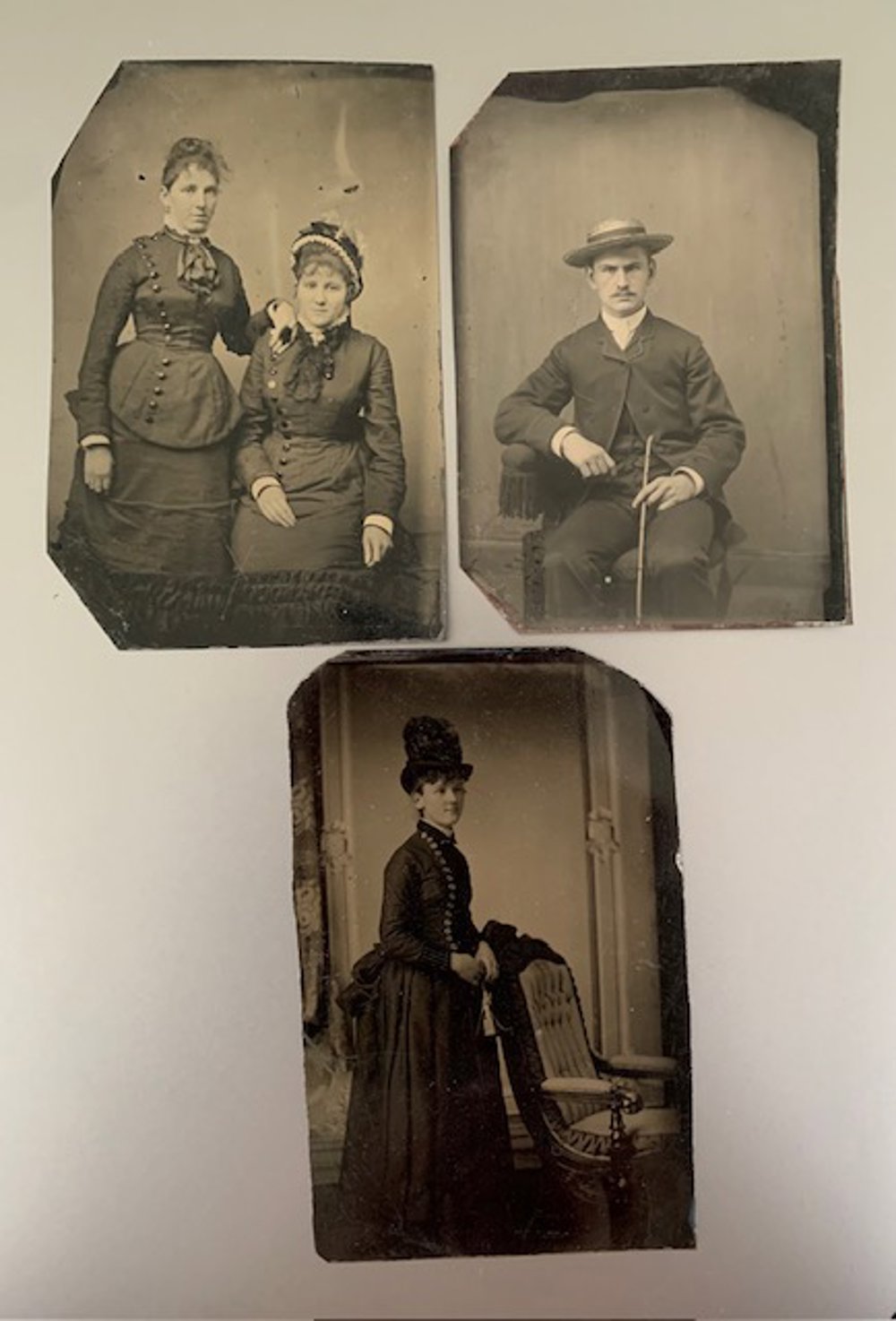 Three vintage tin type photos. Love the dapper gentleman photo. He looks very perturbed! t would be great to copy and make a greeting card out of.