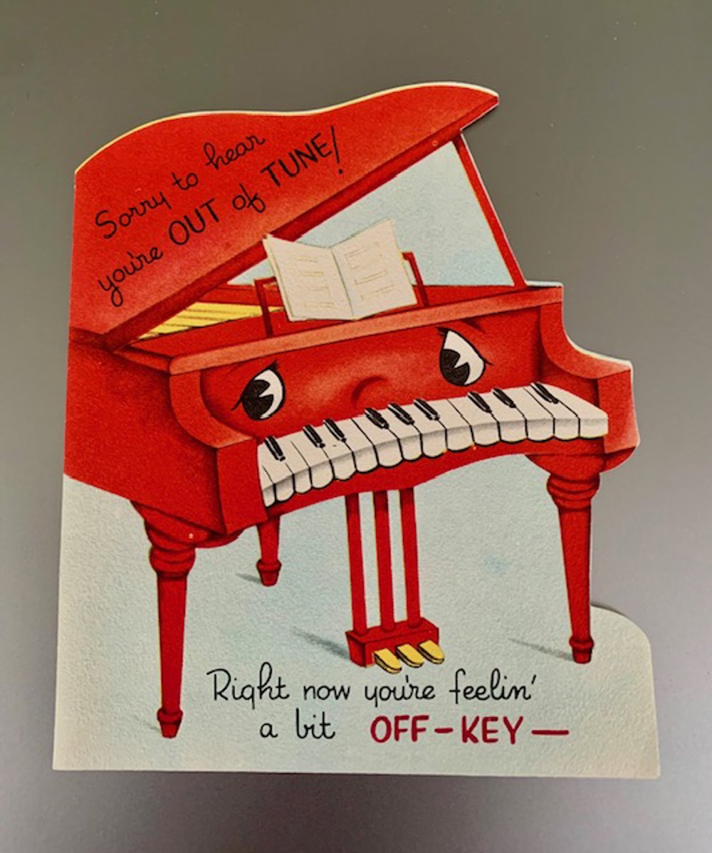 Vintage Anthropomorphic Piano Get Well Card. The back reads "The DA Line Made in USA". Measures 5 1/4" long. Never used. Excellent shape.