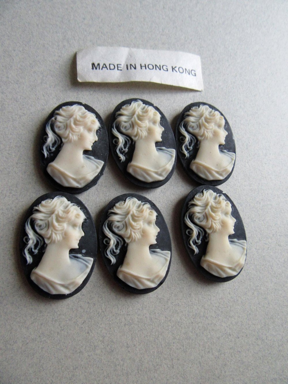 Vintage black and cream cameo cabochons. Lot of six. Never used.