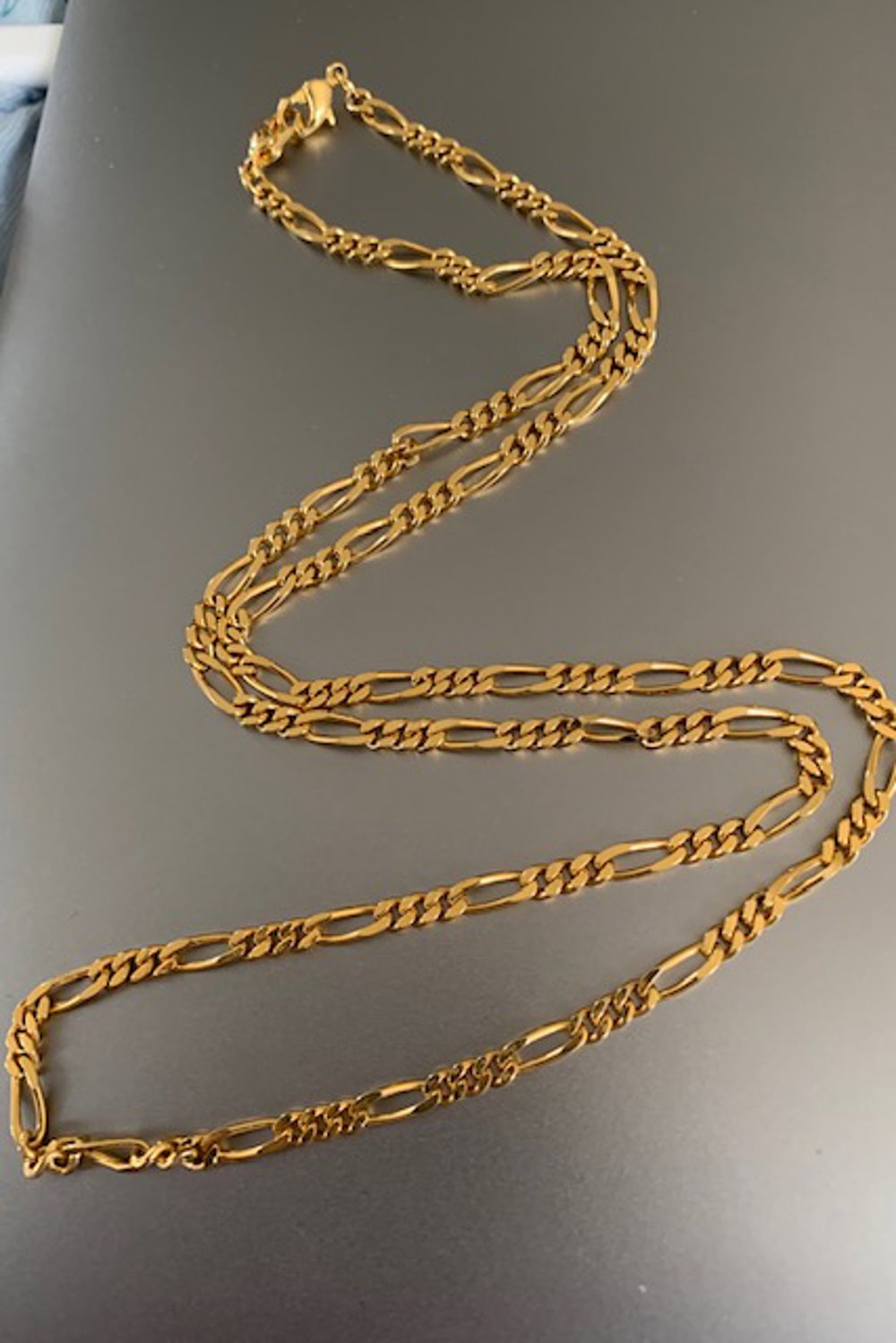 Gold tone figuro link chain. It. measures 24" long. Travel safe jewelry. Leave the good stuff home!