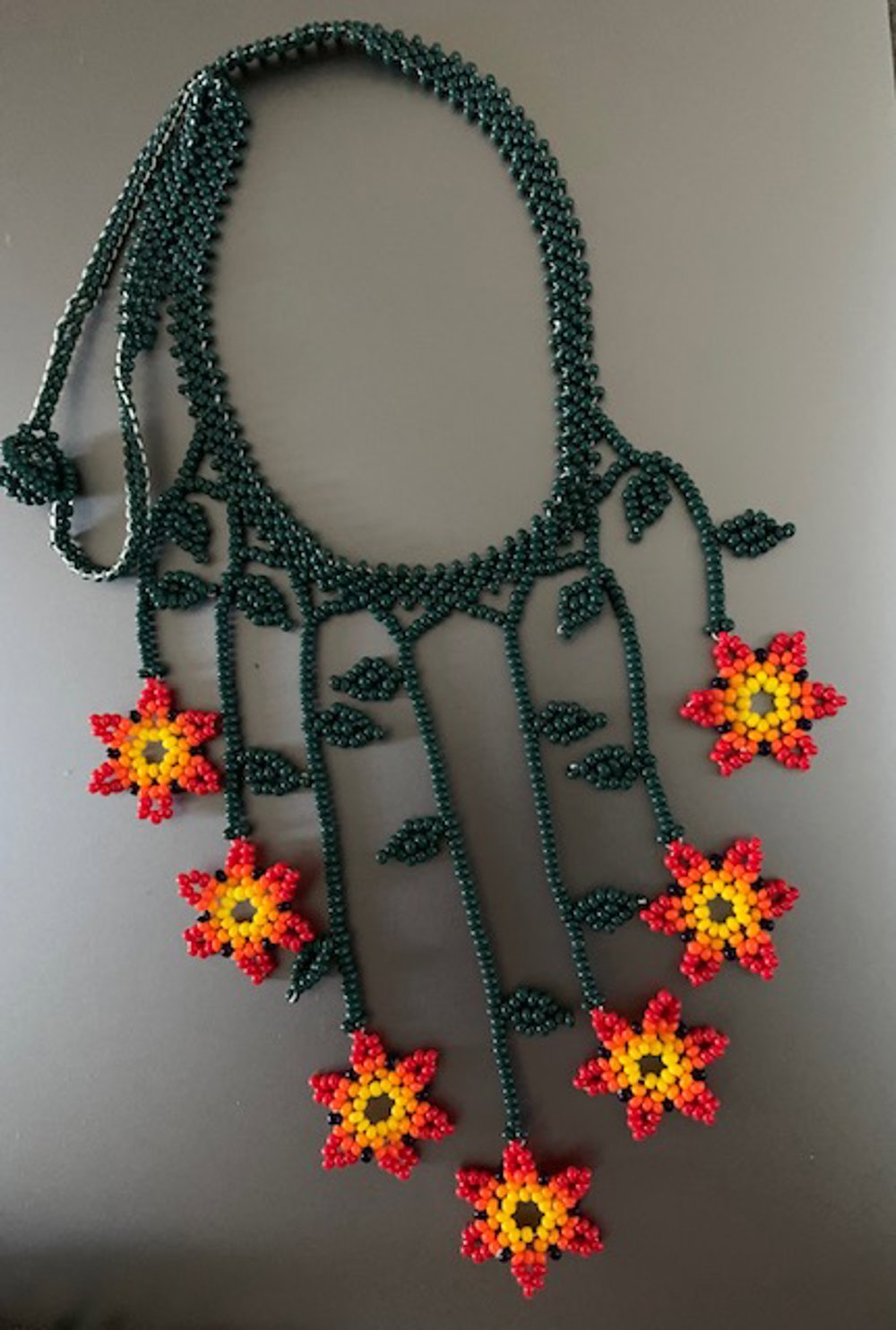 Artisan made hand beaded glass seed beads drippy hanging flowers necklace. Very intricately made. Such a happy necklace! Sure to bring smiles. It measures 17" long and the center flower strand measures 4" long. The closure has a beaded loop and ball. Excellent shape. Not a vintage piece, but not brand new.