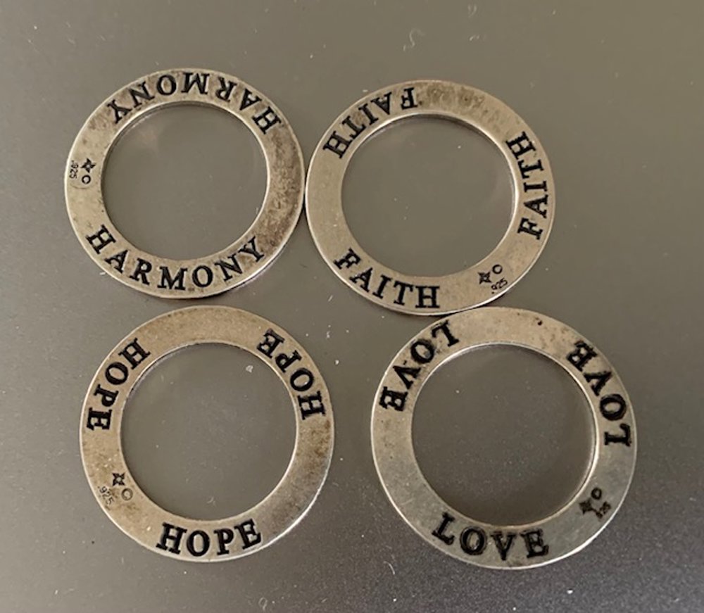 Four sterling silver Hope, Faith, Harmony and Love ring pendants or charms. Wear all together or a couple or one! They measure 1" across. Each one signed with two symbols and 925 (sterling). They weigh 10 grams together. I will polish before shipping. Not vintage.