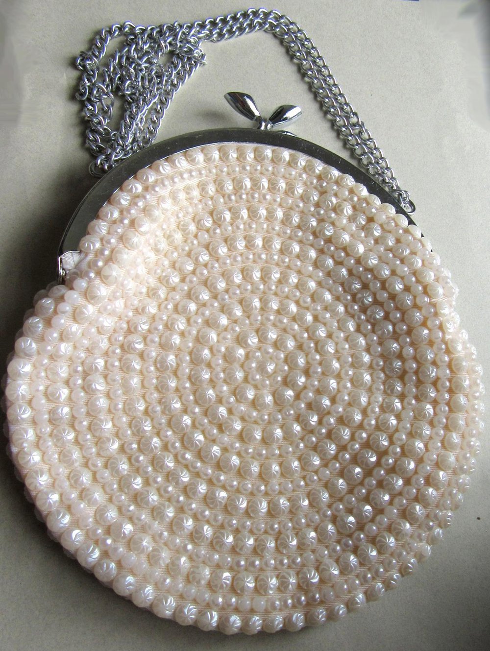 Vintage pearly purse with silver tone double chain handle. Kiss style clasp.