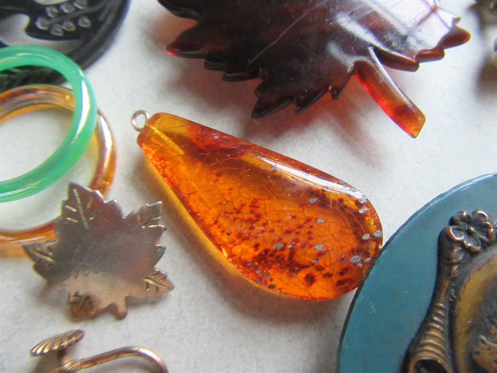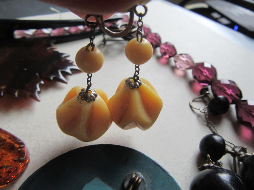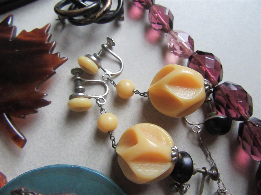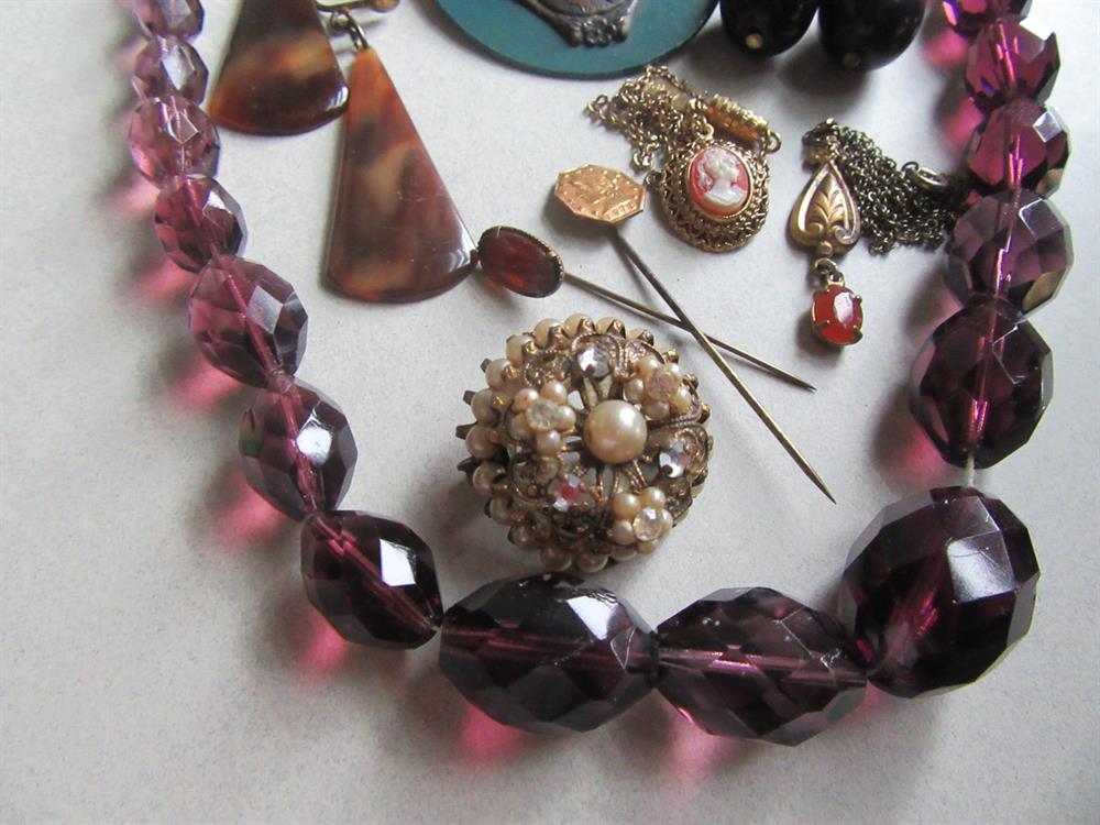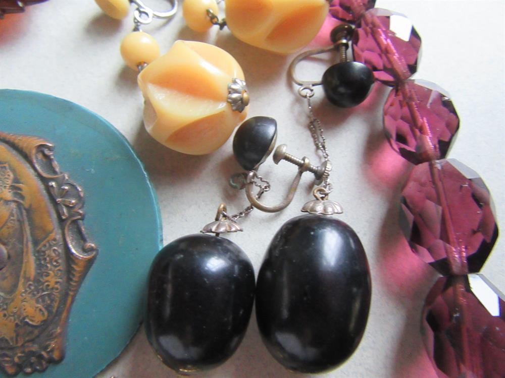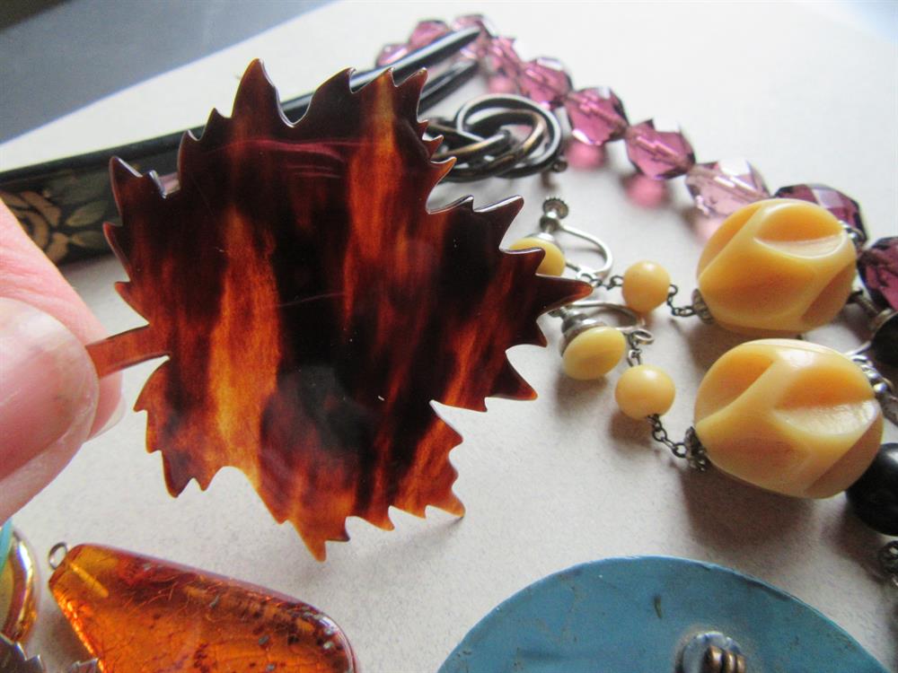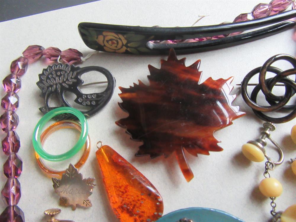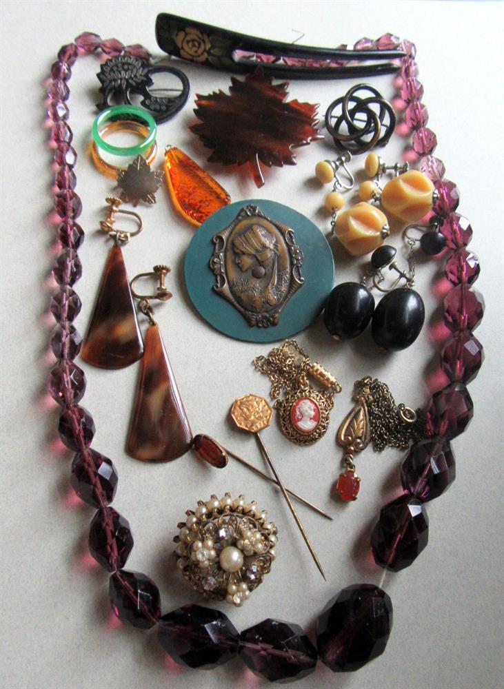 Vintage jewelry lot. Great variety of pieces here. glass, genuine amber pendant, celluloid, tortoise shell, lucite and more. The purple faceted glass necklace needs to be restrung. Please view all 13 photos for condition. Anything major has been mentioned. All lots are sold all sales fina;