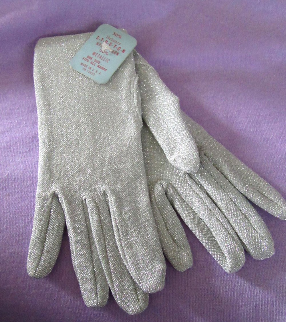 Vintage 1960's ladies silver nylon metallic gloves. Never worn. with the original tag and they are in mint shape.