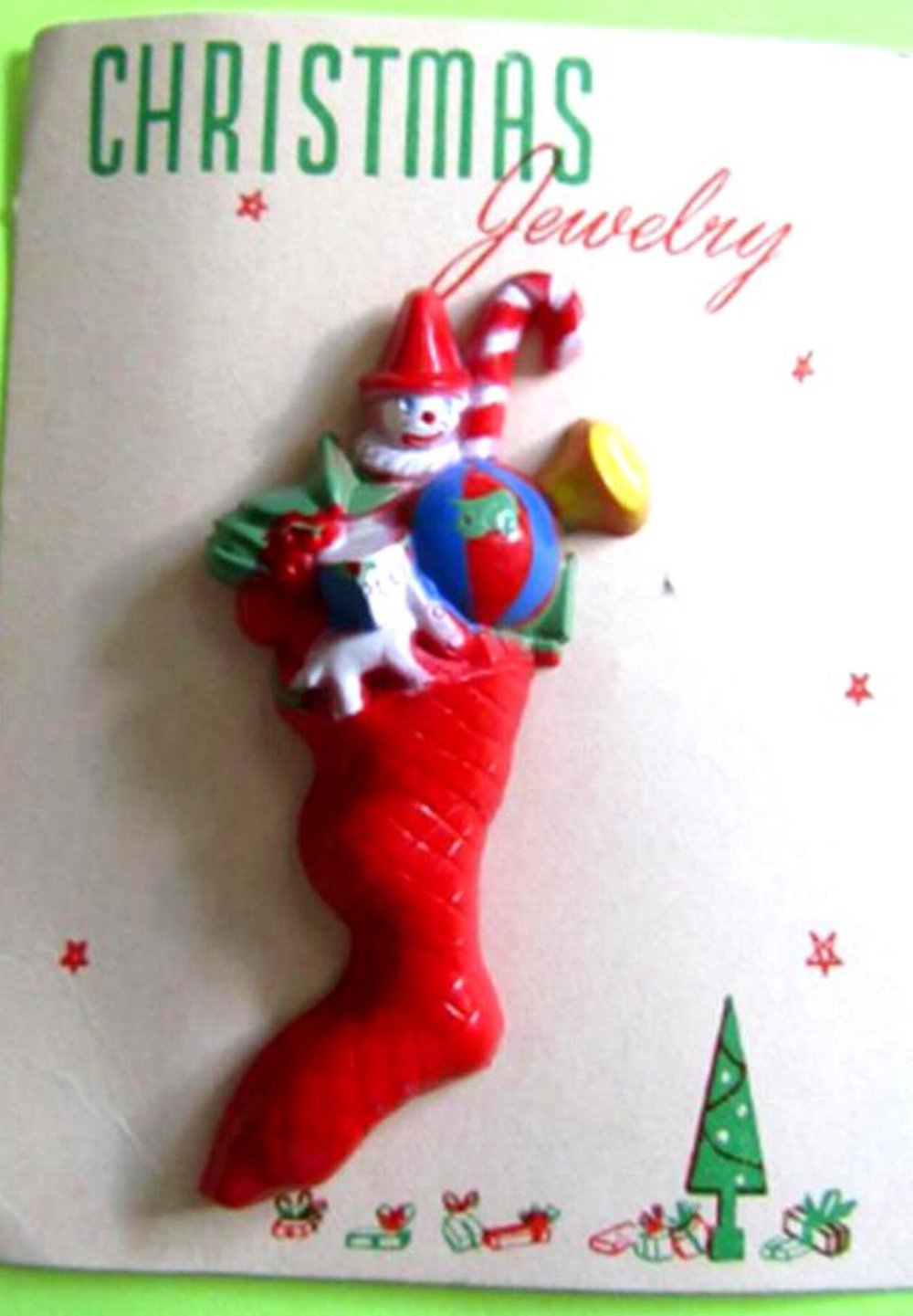 Original never worn 1950's hard plastic red stocking pin filled to the brim with toys. It is on its original card. Look at the graphics on the card!The pin measures 2 3/4" long. It has a safety pin style pin.
