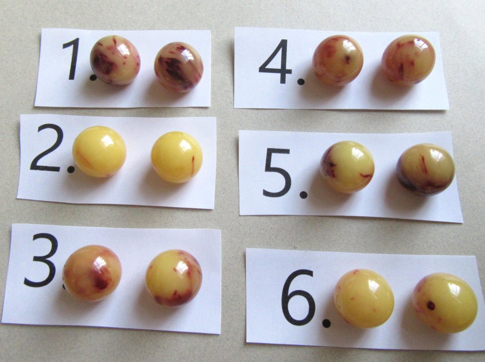 Egg yolk with lovely cranberry swirls. They measure 3/4" across.