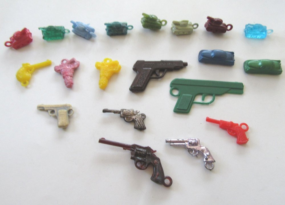 Vintage gum ball machine charm lots. Tanks, guns and throwing in two small cars which I don't know if they are charms are not. One of the larger guns is marked Lido.