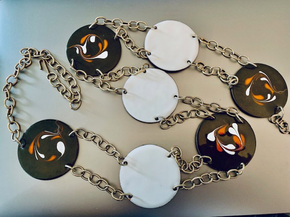 Alternating brown discs with orange and white swirls and solid bright white discs. No discolorations to the white enamel. A hook on either end.
