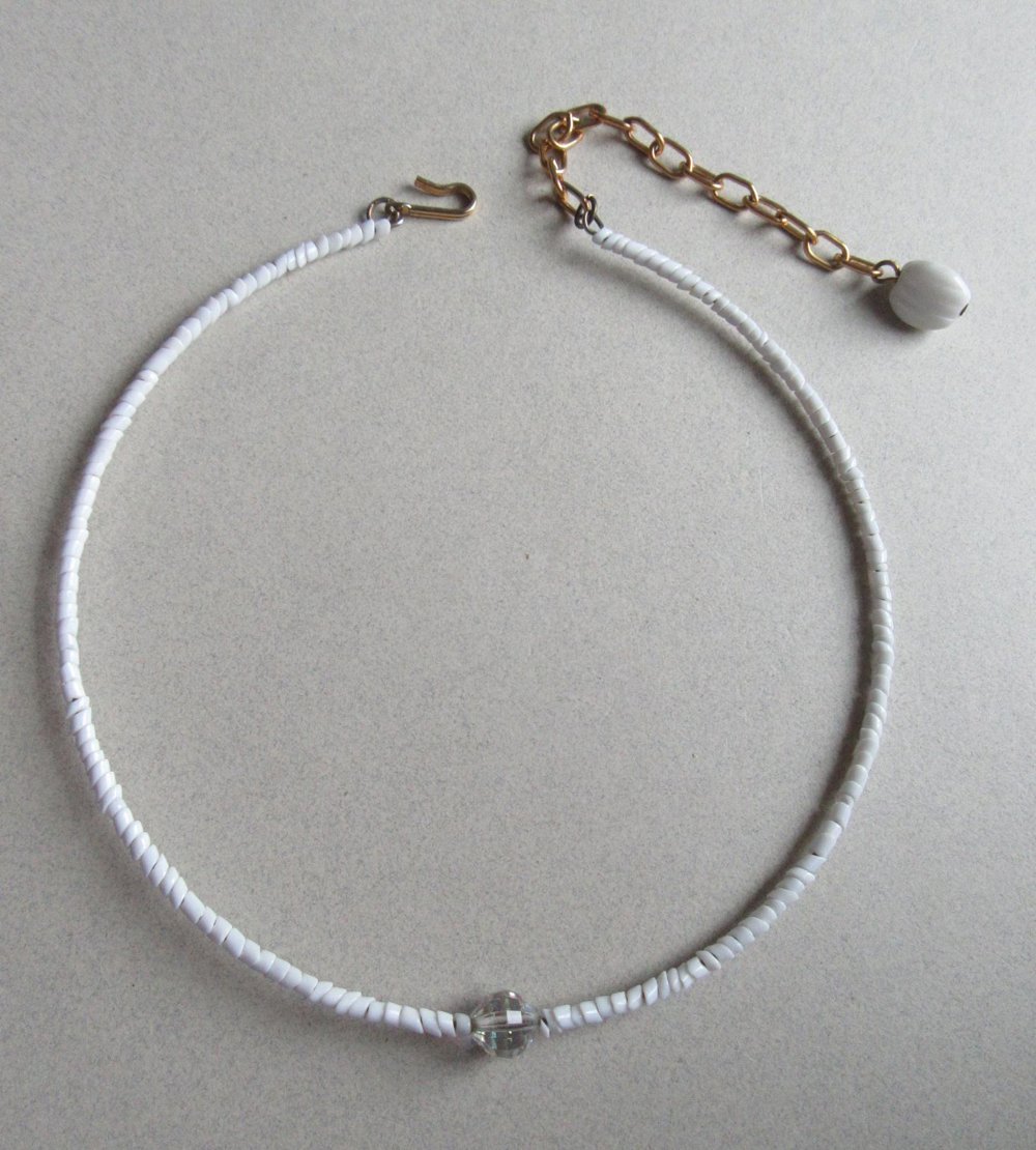 This necklace has white glass jagged glass beads and a center aura borealis crystal.This necklace used to have a paper Laguna tag, but it is long gone.
